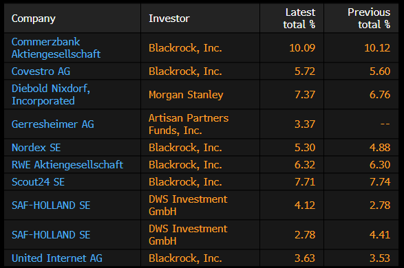 Principali variazioni percentuali e notizie dalle singole società nell'indice DAX. Fonte: Bloomberg