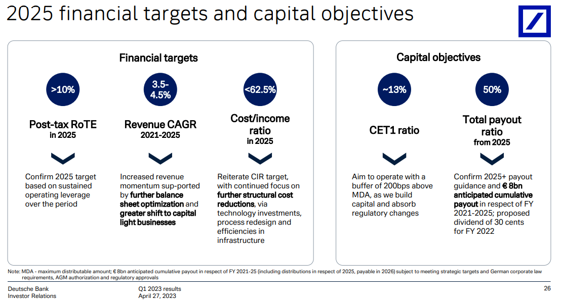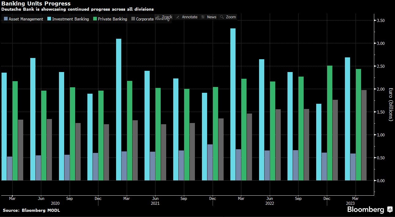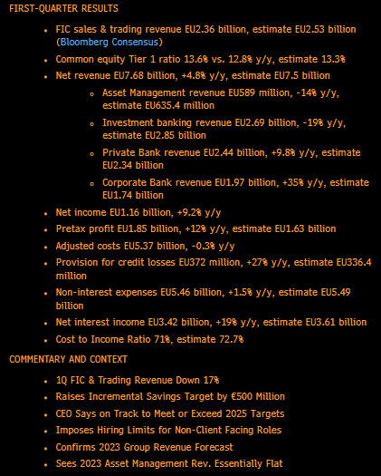 I risultati di Deutsche Bank sono stati relativamente contrastanti. La banca ha comunicato che i suoi utili sono aumentati e che cercherà di avviare un programma di riacquisto di azioni proprie nella seconda metà di quest'anno. Inoltre, la banca prevede di tagliare le spese di 500 milioni di euro, per un risparmio totale di 2,5 miliardi di euro, riducendo l'organico e migliorando le divisioni mutui e retail. D'altra parte, però, l'umore è impattato dai deboli risultati del trading sul debito (FICC, tabella presentata per Barclays). La banca ha mantenuto i suoi obiettivi di guadagno a lungo termine, aggiungendo che intende superare le previsioni di guadagno. I ricavi migliori del previsto sono principalmente attribuibili al forte andamento degli interessi nel corporate e private banking, che ha neutralizzato le prospettive negative per i risultati di IB e FICC.