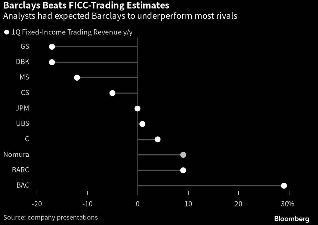 Barclays FICC è salita del 9%, superando le aspettative degli analisti. Fonte: Bloomberg