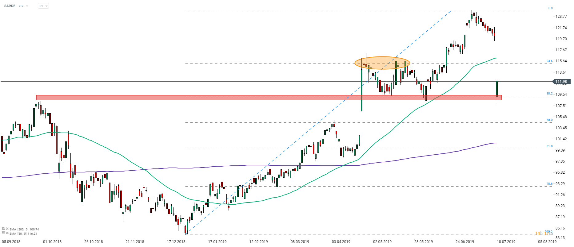 SAP (SAP.DE) ha avuto un buon primo semestre - il prezzo delle azioni ha registrato un rally superiore al 43% e ha raggiunto un nuovo massimo storico di un livello inferiore a quello di € 125. Tuttavia, con il calo dell'YTD di oggi è stato ridotto a circa il 28%. Il titolo si è aperto in prossimità del 38,2% del livello di Fibo e sta cercando di recuperare alcune perdite nelle prime ore del commercio. Nel caso in cui si prosegua con una mossa verso l'alto, il primo livello di resistenza da guardare è di € 115,10, dove sono localizzati il livello di Fibo del 23,6% e i massimi locali di aprile e maggio. Fonte: xStation5
