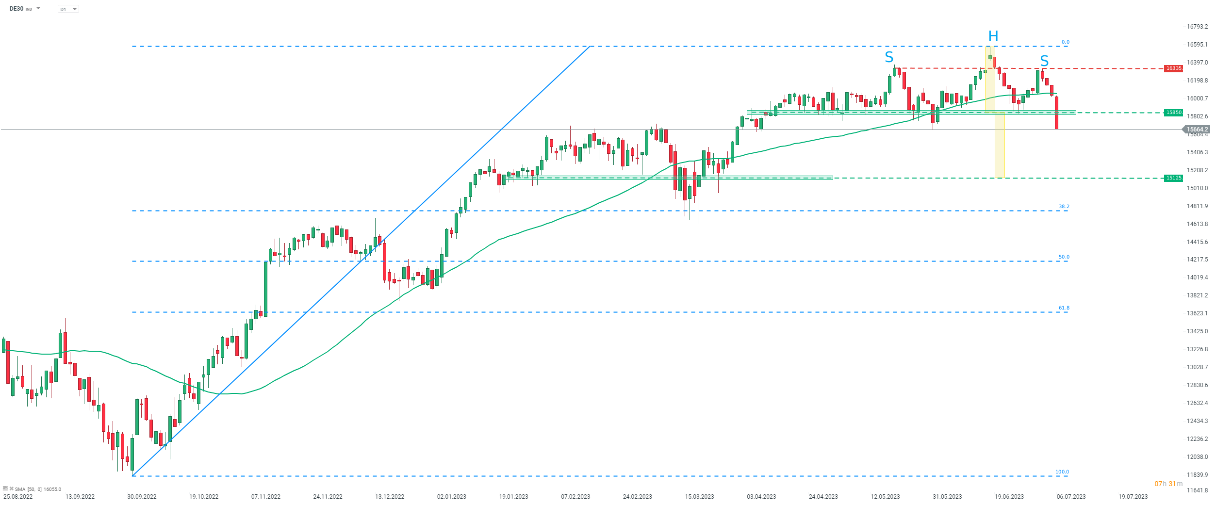 Dando un'occhiata al grafico del DAX tedesco (DE30) D1, possiamo vedere che l'indice è in calo oggi. DE30 sta attualmente testando i minimi di fine maggio 2023 che possono essere trovati vicino a 15.650 punti. Un punto da notare è che oggi l'indice è sceso al di sotto della zona di supporto di 15.850 punti. Questo è importante dal punto di vista tecnico in quanto questo supporto segnava la scollatura di un modello testa e spalle. Un movimento oltre apre la strada a un calo maggiore che punta all'area di 15.125 punti.