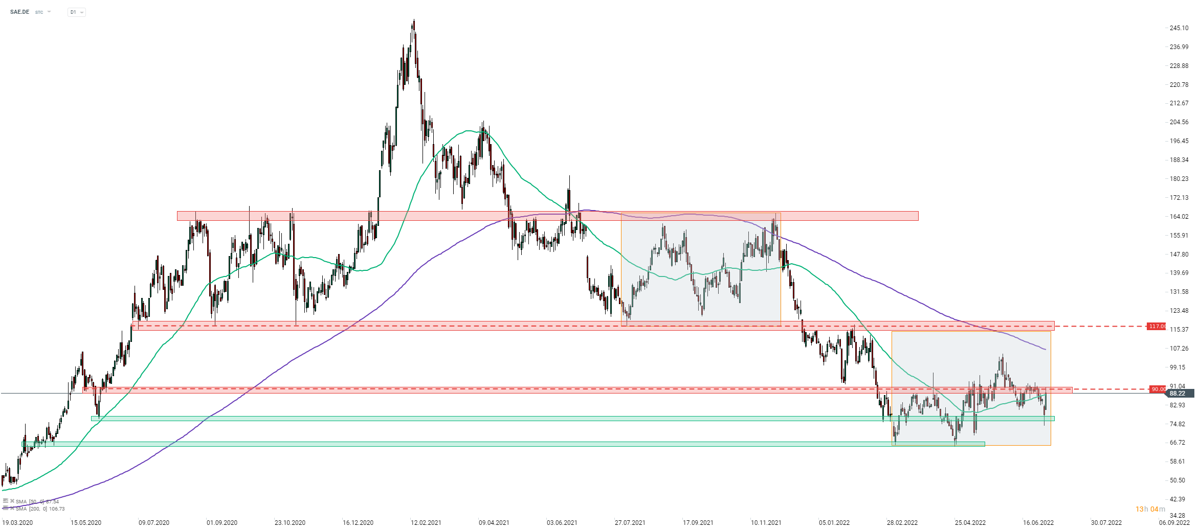 Shop Apotheke (SAE.DE) è in rialzo dopo il rilascio dei risultati preliminari del secondo trimestre. L'azienda oggi sale di oltre il 10% e sta testando la zona di resistenza che oscilla intorno a € 90,00. Tuttavia, il trend ribassista è ancora in gioco e le prospettive a medio termine miglioreranno solo quando il prezzo delle azioni supererà il limite superiore della struttura Overbalance vicino a € 117,00. Fonte: xStation5