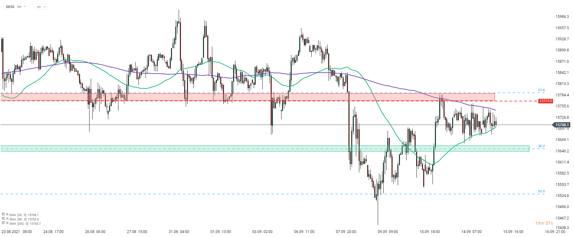 La situazione dell'indice tedesco DE30 non è cambiata molto dalla nostra analisi di ieri. L'indice si è mosso lateralmente tra la zona di supporto contrassegnata con il 38,2% del ritracciamento del movimento al rialzo lanciato a metà luglio e la zona di resistenza contrassegnata con il 23,6% del ritracciamento. Tuttavia, uno sguardo alla media mobile sul grafico H1 ci dà un po' più di chiarezza. L'indice tedesco si è trovato recentemente in un range ristretto, contrassegnato dalla media mobile a 200 ore (linea viola, limite superiore) e dalla media mobile a 50 ore (linea verde, limite inferiore). L'indice sta attualmente testando il limite inferiore del range e se venisse superato potrebbe portare a un test del suddetto ritracciamento (38,2%) (area 15.650 punti).