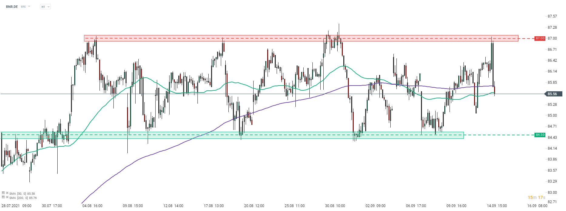 Brenntag (BNR.DE) ha iniziato la sessione di trading di oggi quasi invariato rispetto al prezzo di chiusura di ieri, ma è salito poco dopo l'inizio della sessione sulla scia delle previsioni aggiornate per l'intero anno. Tuttavia, il prezzo non è riuscito a superare il limite superiore dell'attuale trading range (87,00 euro). Il titolo si è ritirato e sta attualmente testando la media mobile a 50 ore (linea verde). Fonte: xStation5