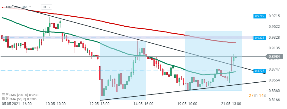 Il titolo Cineworld (CINE.UK) ha iniziato la sessione odierna in rialzo e ha superato il limite superiore della formazione triangolare. Se il sentimento attuale prevale, il movimento al rialzo potrebbe accelerare verso la resistenza a £ 0,9328 che è contrassegnato con il limite superiore della struttura 1: 1 e 200 SMA (linea rossa). La zona di supporto più vicina si trova intorno a £ 0,8727. Fonte: xStation5