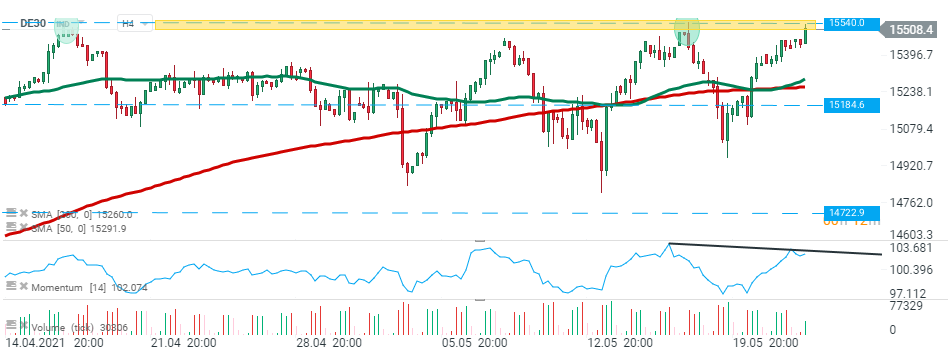 DE30 ha iniziato un altro impulso al rialzo la scorsa settimana e lo ha continuato per tutta la sessione asiatica di oggi. Attualmente l'indice si sta avvicinando al suo massimo storico a 15540 punti, tuttavia la divergenza ribassista è apparsa sull'indicatore Momentum mentre il volume è in calo. Il supporto più vicino si trova a 15184 punti. Fonte: xStation5