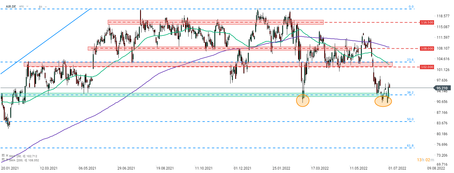 Airbus (AIR.DE) ha iniziato la sessione odierna in rialzo, ma ha già quasi completamente cancellato tutti i guadagni di oggi. Tuttavia, il panorama tecnico sembra piuttosto rialzista: il prezzo è riuscito a difendere la zona di supporto segnata con il 38,2% del ritracciamento della mossa di ripresa post-pandemia e la strada verso la zona di resistenza che supera i 102€ è lasciata aperta. Fonte: xStation5