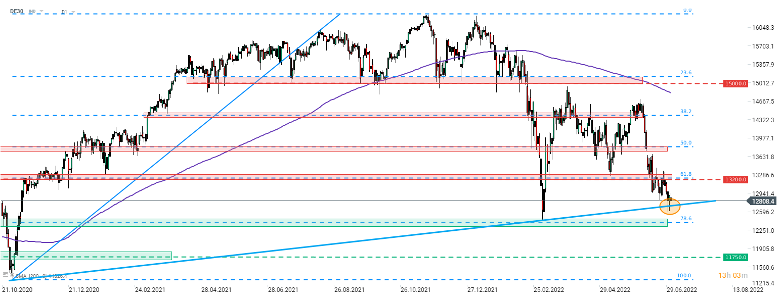 DE30 è riuscito a difendere una linea di tendenza al rialzo a medio termine che è stata testata alla fine della settimana precedente (cerchio arancione). Tuttavia, non è riuscito a iniziare una mossa di ripresa in seguito e DE30 continua ad aggirarsi appena al di sopra della linea di tendenza sopra menzionata. Pertanto, non si può escludere un altro tentativo di superare la linea di tendenza nell'area dei 12.700 punti. Se la situazione dovesse cambiare, la prossima zona di supporto può essere trovata al 78,6% del ritracciamento (area di 12.400 punti). D'altra parte, se dovesse iniziare una mossa di ripresa, il primo livello da tenere d'occhio sarà una zona di resistenza vicino al 61,8% del ritracciamento nell'area dei 13.200 punti.