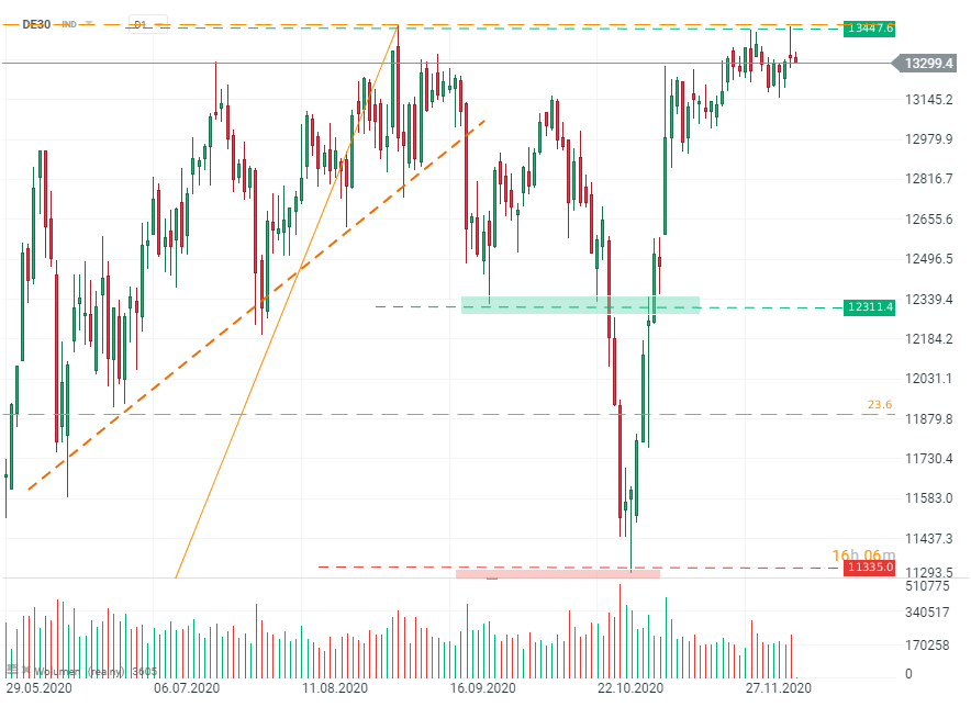 DE30 ieri ha effettuato il terzo tentativo di superare il livello di 13.450 punti. Lo stoppino lungo superiore del candelabro quotidiano può essere visto come un avvertimento, soprattutto perché è stato raggiunto in un'area così chiave. Fonte: xStation5