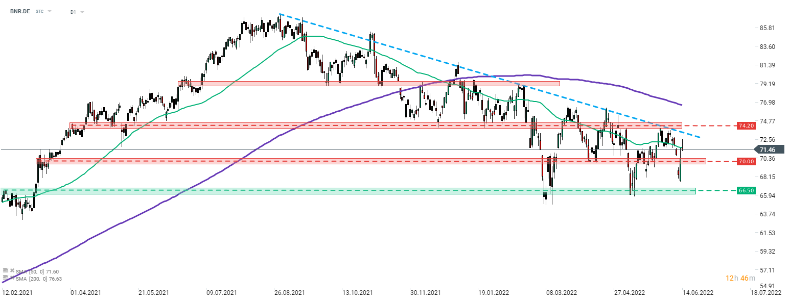 Brenntag (BNR.DE) ha iniziato la sessione di trading di oggi con un gap di prezzo rialzista poiché il titolo ha reagito a un aggiornamento previsto. Tuttavia, il prezzo testa ancora una volta la media mobile a 50 sessioni (linea verde), che ieri ha interrotto il movimento. Le azioni devono affrontare una serie di livelli di resistenza a breve termine - media mobile, linea di tendenza e zona di resistenza di € 74,20 - e un movimento al di sopra di quelli sarebbe necessario per invalidare la struttura del trend ribassista. Fonte: xStation5