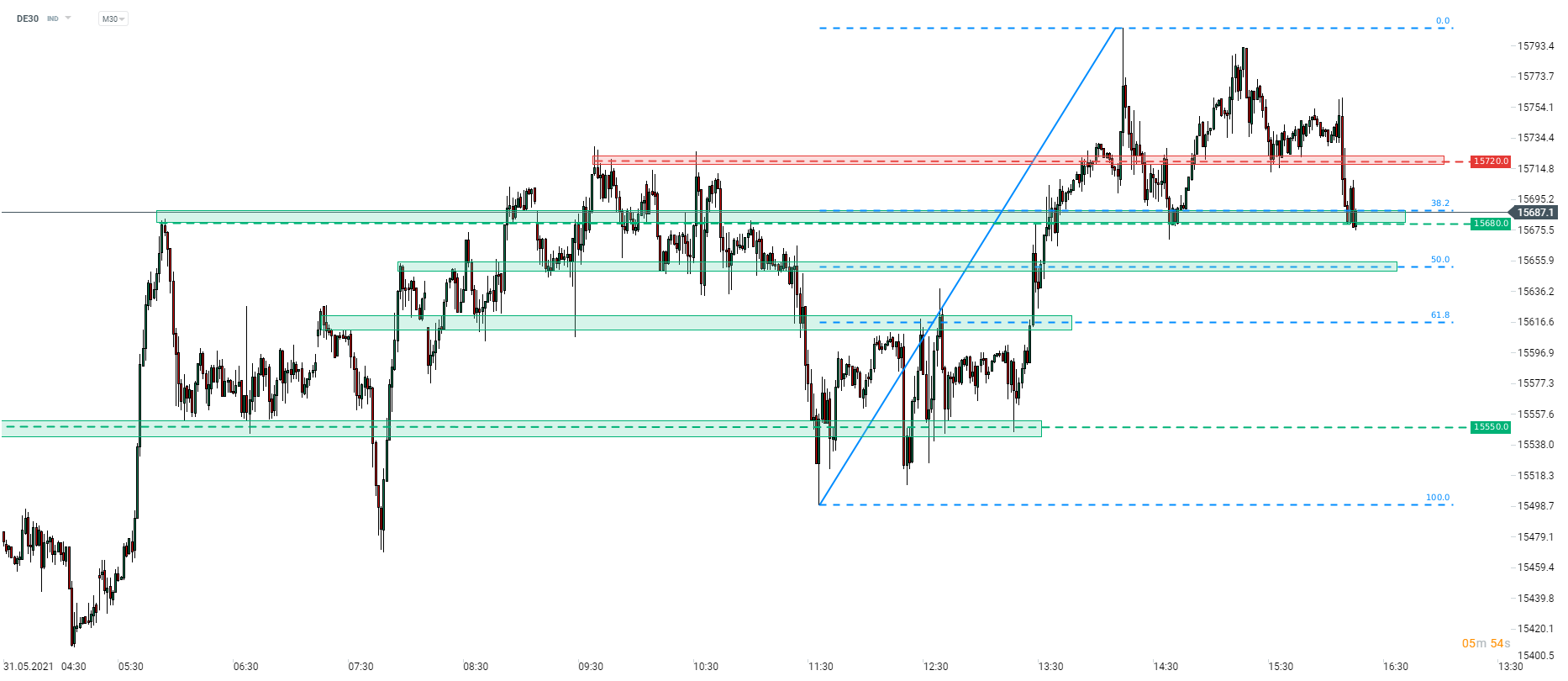 Il DAX tedesco (DE30) ha iniziato la sessione di oggi quasi invariato, ma da allora si è ritirato. L'indice ha ritestato i minimi di lunedì a 15.680 punti (38,2% del ritracciamento del movimento al rialzo iniziato il 9 giugno). La performance futura dell'indice dipenderà dalla capacità di difendere l'area. la resistenza da osservare può essere trovata a livello di swing 15.720 pt. D'altra parte, se venisse superata l'area potrebbe portare il pullback dell'indice verso i due ritracciamenti inferiori - 50% del ritracciamento a circa 15.650 pt e 61,8% del ritracciamento nell'area di 15.615 pt.