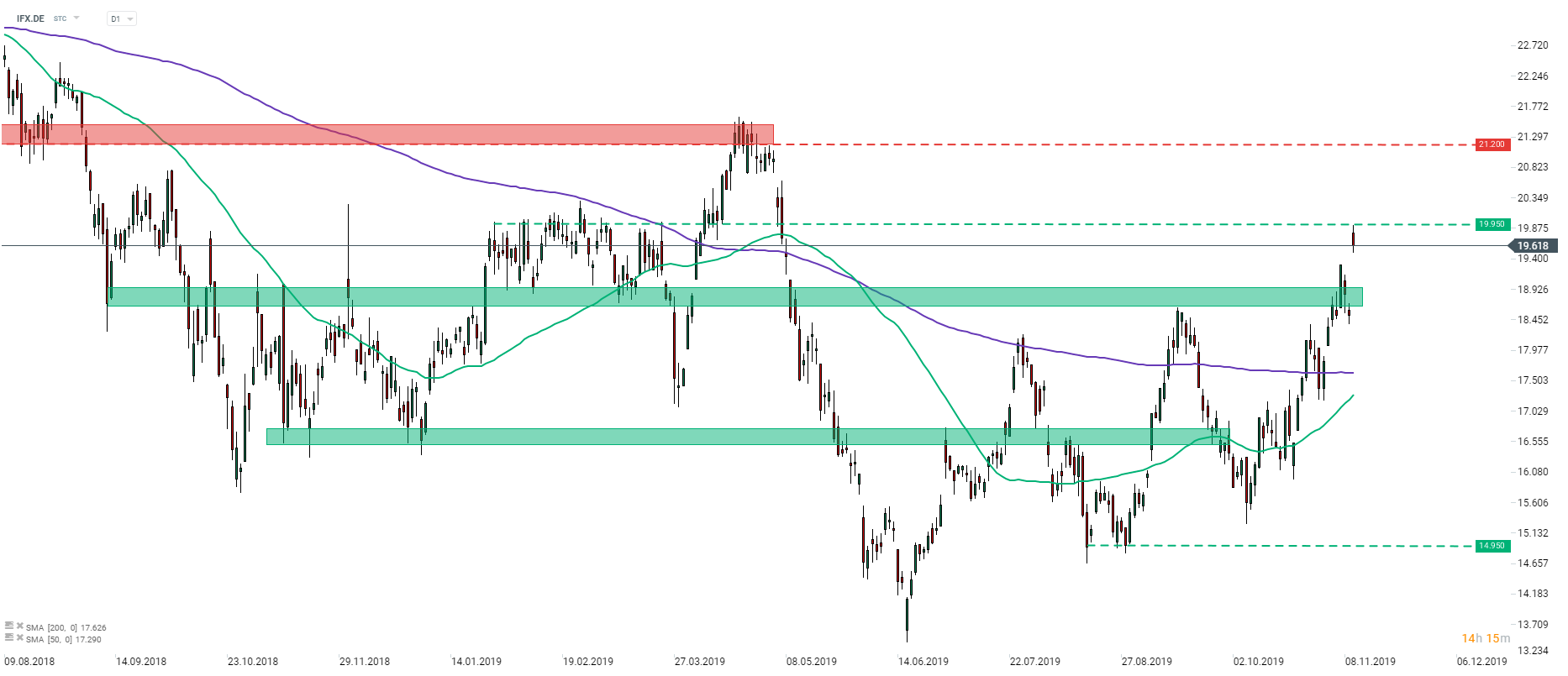 Infineon (IFX.DE) ha aperto oggi con un enorme divario di prezzo al rialzo. Gli investitori sembrano essere soddisfatti del rapporto sugli utili rilasciato dalla società. Il titolo ha testato la resistenza a € 19,95 poco dopo l'apertura della sessione, ma non è riuscito a superarla. Questo livello è la resistenza a breve termine da tenere d'occhio. Quando si tratta di livelli di supporto da tenere d'occhio, i trader dovrebbero concentrarsi sulla zona che va al di sotto di € 19,00. Fonte: xStation5