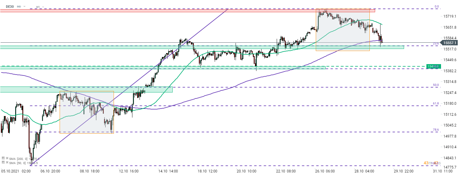 DE30 ha testato la zona di supporto a 15.550 punti questa mattina, ma non è riuscito a superarlo. Questa zona è contrassegnata dal 23,6% del ritracciamento del recente impulso al rialzo, nonché dal limite inferiore della geometria del mercato e dalle precedenti reazioni di prezzo. L'indice è riuscito a risalire fino alla media mobile a 200 ore, ma fatica a superarlo. La reazione positiva alla zona di 15.550 punti suggerisce che la correzione potrebbe perdere forza e sta per terminare. Conferma inoltre che il trend rialzista è ancora in gioco. L'indice ha registrato poche reazioni al rilascio del PIL del terzo trimestre dall'Europa e si prevede che i dati previsti per la parte successiva della giornata (PCE USA) avranno un impatto limitato. La zona di 15.550 punti è importante da tenere d'occhio poiché superarla potrebbe suggerire una potenziale inversione di tendenza a breve termine.