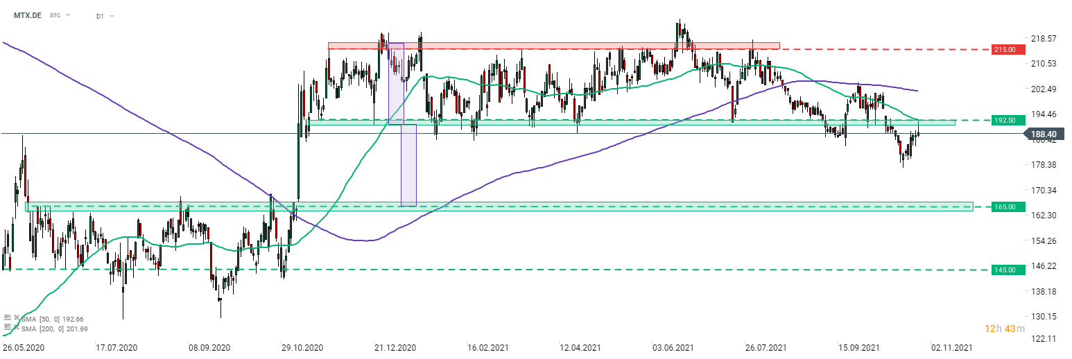 MTU Aero Engines (MTX.DE) è salito dopo il rilascio degli utili del terzo trimestre, ma la maggior parte della mossa di oggi è stata cancellata ormai e le azioni sono quasi invariate. Il prezzo non è riuscito a tornare sopra la zona di prezzo di € 192,50 che segna il limite inferiore del precedente range di trading. Non si può escludere un movimento verso il minimo recente. Fonte: xStation5