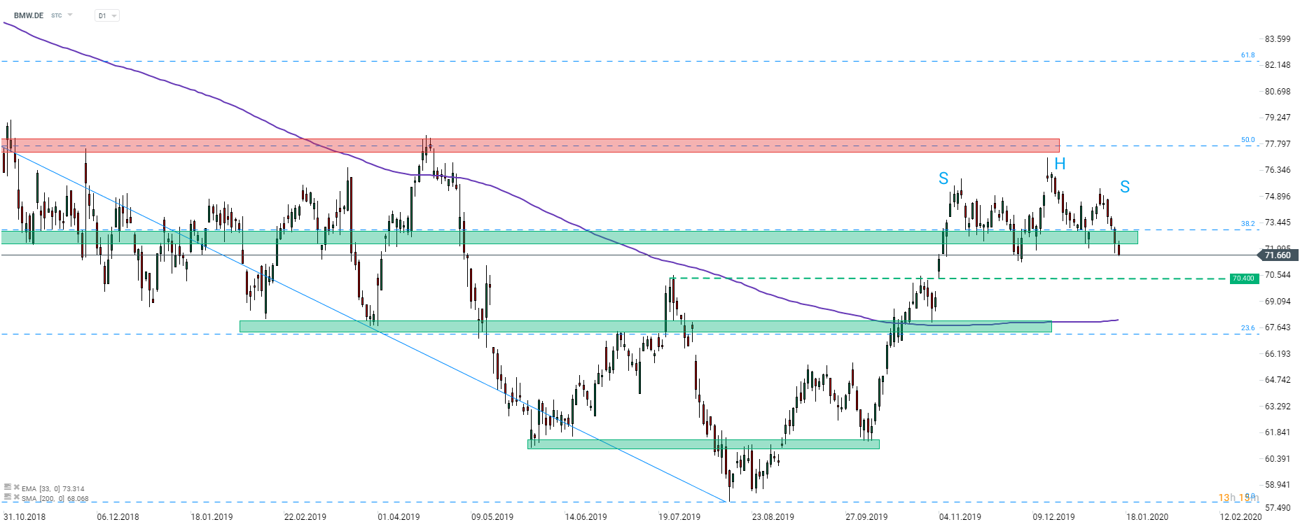 La BMW (BMW.DE) tenta di oltrepassare la zona di supporto che si avvicina al 38,2% di Fibonacci del movimento al ribasso iniziato nel 2018. I trader dovrebbero prestare attenzione al pattern testa e spalle: il suo obiettivo punta a € 70,40, dove si possono anche trovare precedenti reazioni ai prezzi. Fonte: xStation5