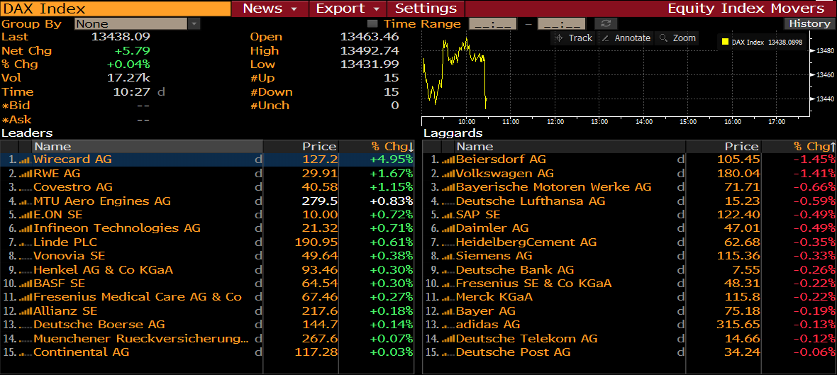 Wirecard (WDI.DE) è il membro DAX con le migliori prestazioni giovedì. Il titolo registra un guadagno vicino al 5%. Tuttavia, finora non sono emersi rapporti che possano giustificare il salto.