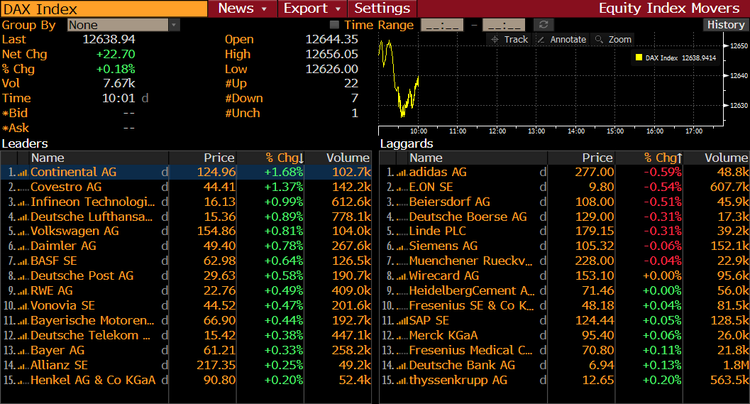 La maggior parte delle azioni quotate nella DE30 sono in rialzo nei primi trade di giovedì. Fonte: Bloomberg