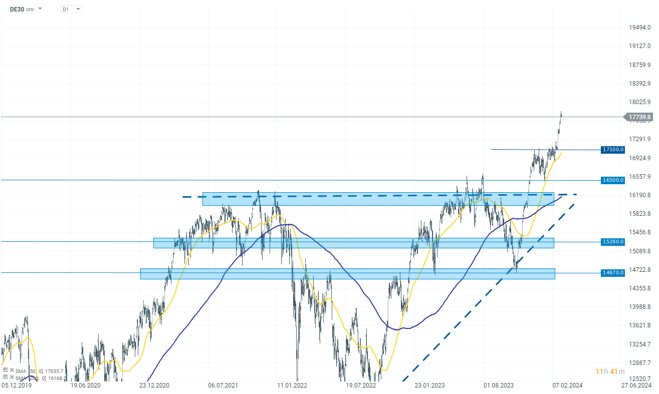 L'indice tedesco è scambiato ai massimi storici. Da metà febbraio il DAX ha registrato un rialzo di oltre il 5,00%, un risultato ancora inferiore rispetto agli indici negli Stati Uniti. La scorsa settimana, il DAX ha registrato 5 giorni consecutivi di guadagni, quindi se oggi l'indice chiude sotto la soglia, dovrebbe essere comprensibile. In caso di correzione maggiore è opportuno tenere presente il livello di 17100 punti, che rappresenta il limite superiore dell'ultimo consolidamento.