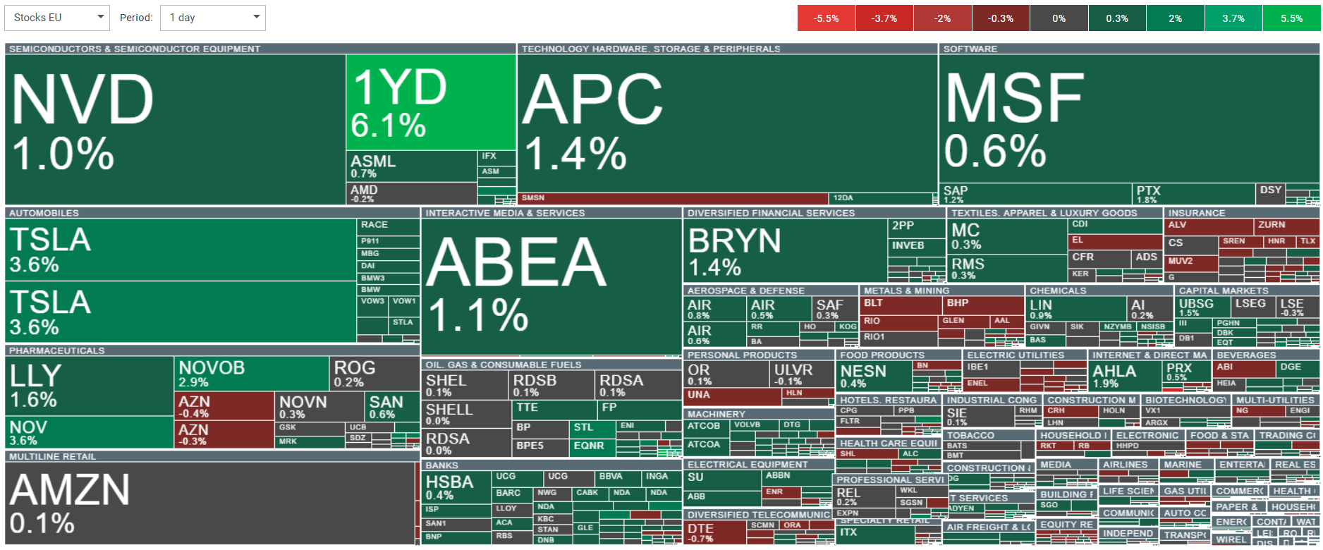 Analizzando la performance settoriale del DAX tedesco, il settore della tecnologia dell'informazione guida i guadagni (+1,01%), seguito da beni di consumo discrezionali (+0,23%) e sanità (+0,22%). Anche materiali (+0,20%), immobiliare (+0,14%) e industriali (+0,11%) sono in territorio positivo.