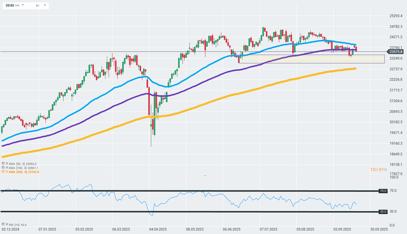 L’indice tedesco DE40 è in calo dello 0,9% nella sessione odierna e sta nuovamente tentando di rompere al di sotto della zona di supporto indicata dalla media mobile esponenziale a 100 giorni (curva viola nel grafico). Finché il DE40 resta sopra queste zone, il trend rialzista complessivo (medio termine) rimane sostenibile nel lungo periodo. L’RSI degli ultimi 14 giorni è quotato a livelli vicini a 46 punti, il che può indicare che le quotazioni attuali rimangono relativamente vicine alla dinamica media delle ultime 14 sedute. Tuttavia, è importante notare che la EMA a 50 giorni è inclinata verso il basso, il che potrebbe indicare che il trend di breve termine è cambiato in ribassista. Fonte: xStatio