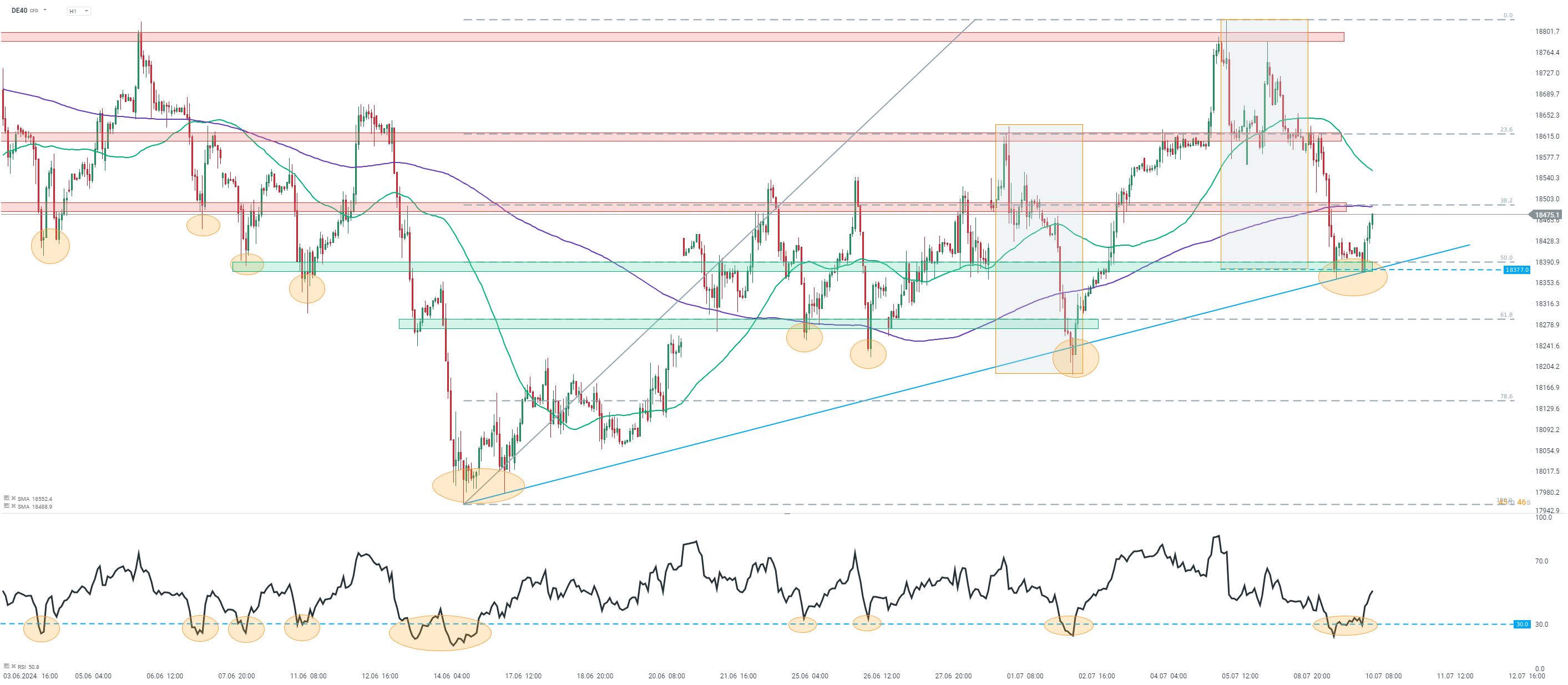 Il DAX tedesco viene scambiato in rialzo oggi, estendendo il rimbalzo dal recente doppio minimo raggiunto nell'area di 18.375 punti. Dando un'occhiata al grafico DE40 nell'intervallo H1, possiamo vedere che la suddetta area di 18.375 punti è contrassegnata da una serie di importanti supporti tecnici. Oltre alle precedenti reazioni dei prezzi, lì si può trovare anche una linea di tendenza al rialzo, un ritracciamento del 50% e il limite inferiore della geometria del mercato locale. Si noti che l'indicatore RSI a 14 periodi è sceso al di sotto dei 30 punti, spesso associati ai minimi locali (cerchi arancioni), e sta rimbalzando da lì. Tutti questi fattori combinati rendono le prospettive tecniche favorevoli ai rialzisti. Se l'attuale movimento di ripresa dovesse continuare, la prima zona di resistenza a breve termine può essere trovata nell'area di 18.500 punti, dove si possono trovare la media mobile a 200 periodi e un ritracciamento del 38,2%. Una zona di resistenza chiave da tenere d'occhio nel breve termine è l'area di 18.800 punti, contrassegnata da massimi recenti.