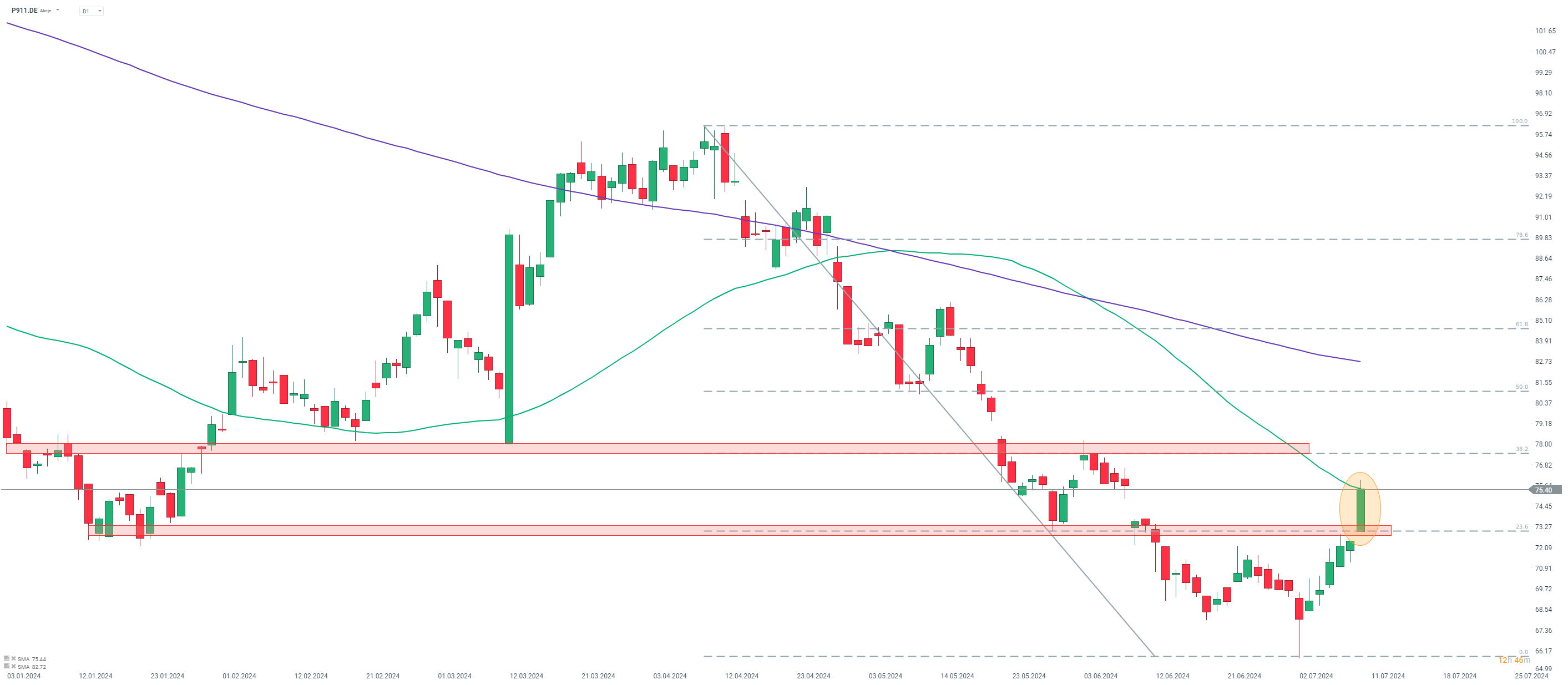 Porsche (P911.DE) è in rialzo del 4% oggi e testa la media mobile di 50 sessioni (linea verde). Le azioni vengono scambiate al livello più alto dal 7 giugno 2024. Fonte: xStation5