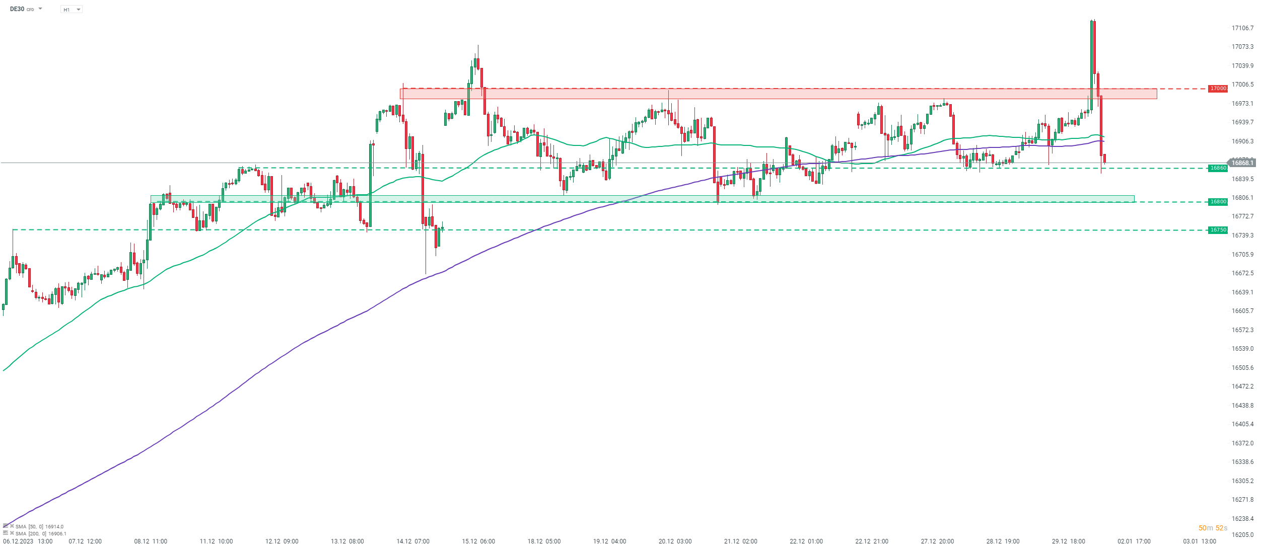 I futures tedeschi sul DAX (DE40) si trovano in un movimento laterale dalla terza settimana di dicembre. Da allora i movimenti dell'indice sono stati in gran parte limitati al range di trading di 16.800-17.000 punti, salvo alcuni falsi breakout. L'indice ha iniziato la sessione cash di oggi con un gap di prezzo rialzista e si è ripreso fino a raggiungere nuovi massimi storici sopra l'area di 17.100 punti. Un massimo intraday è stato raggiunto vicino a 17.120 punti. Tuttavia, l'indice non è riuscito a rimanere a questo livello ed è sceso nuovamente nell’intervallo 16.800-17.000 punti. Sembra che il sell-off si sia fermato nell'area di oscillazione di 16.860 punti, almeno per ora. Tuttavia, sarebbe probabilmente necessario un superamento netto della resistenza di 17.000 punti o al di sotto del supporto di 16.800 punti per determinare la direzione di un prossimo grande movimento.