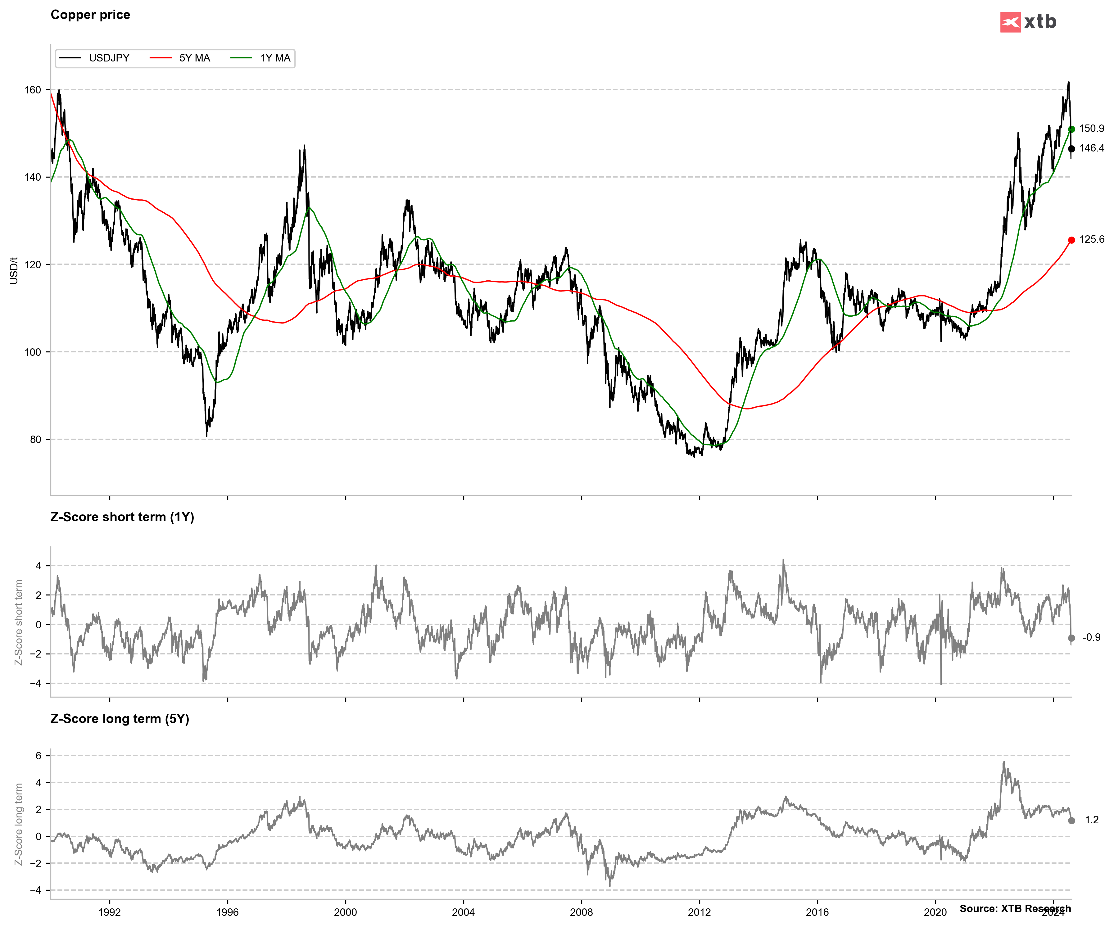 Quando si segue l’azione del prezzo dello JPY, vale la pena ricordare cosa è successo allo yen all’inizio degli anni ’90 e poi dopo il 2007, quando gli investitori hanno iniziato a ridurre i carry trade. In termini di sottovalutazione, si può vedere che la coppia USDJPY ha deviato circa 2 volte dalla media di un anno all'inizio degli anni '90 e nel 2007. Successivamente, è stato generato un segnale di rafforzamento eccessivo quando ha deviato 2-3 volte nell'altro direzione. Attualmente, da un orientamento positivo di 2 volte, l'USD/JPY è sceso a un orientamento negativo di 1 volta (da qui una possibile reazione positiva). Tuttavia, se la storia dovesse ripetersi, c’è ancora molto spazio per scendere, dato che l’USD/JPY stava scendendo ad almeno 2-3 volte il bias negativo. Inoltre, i trend al ribasso dell'USD/JPY sono durati per decenni. Fonte: Bloomberg Finance LP, XTB