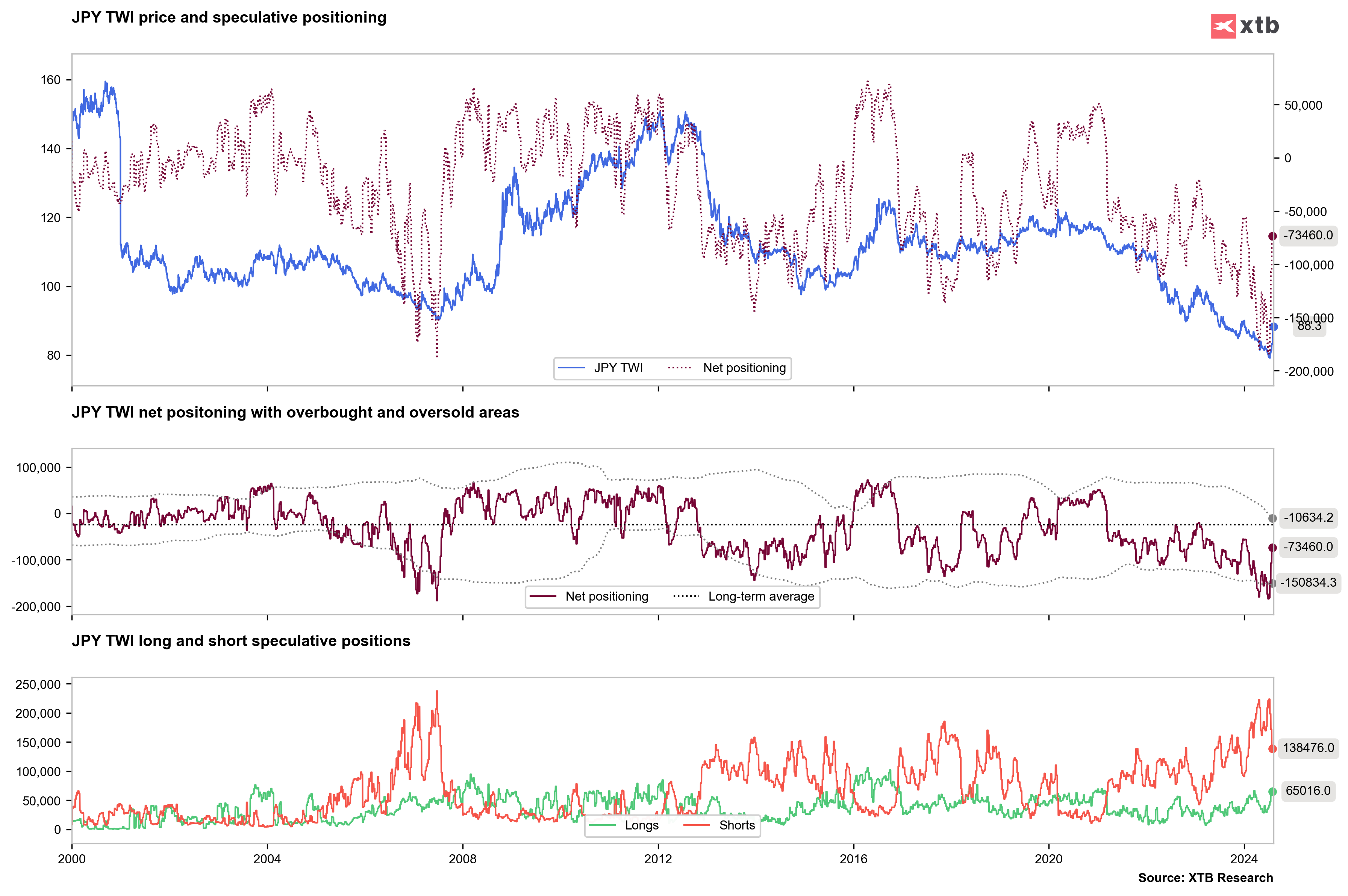 Le posizioni corte sullo yen vengono estremamente ridotte. Questa tendenza continuerà e presto lo yen sarà più acquistato che venduto dagli speculatori? Fonte: Bloomberg Finance LP, XTB
