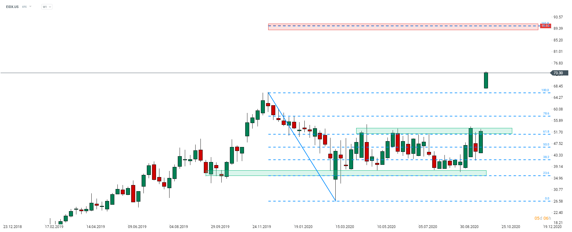 Dopo l'enorme gap di oggi in apertura, il prezzo delle azioni di Eidos Therapeutics (EIDX.US) non solo è balzato al di sopra di una resistenza al 61,8% del ritracciamento del calo di inizio anno, ma ha anche raggiunto un nuovo massimo storico. Il prezzo si trova di circa il 10% al di sopra del massimo storico raggiunto a metà dicembre 2019 e la resistenza più vicina si può trovare al ritracciamento esterno del 161,8% (area di $ 90,50). Fonte: xStation5