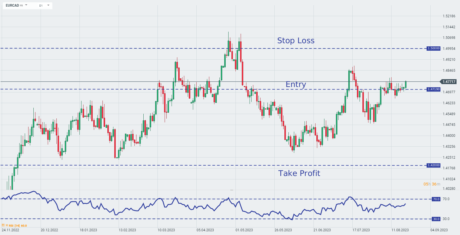 Goldman Sachs consiglia di aprire una posizione Long sulla coppia EUR/CAD a 1,4719 con un obiettivo a 1,4200 e un ordine di stop loss a 1,5000. Fonte: xStation 5