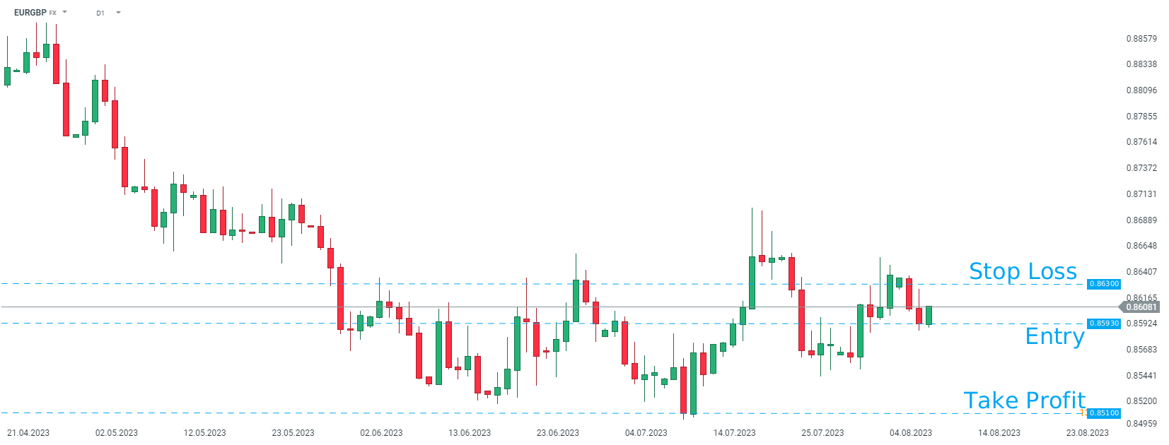 IFR consiglia di aprire una posizione Short su EURGBP al prezzo di mercato con un obiettivo di 0,8510 e un ordine di stop loss posizionato a 0,8630. Fonte: xStation5