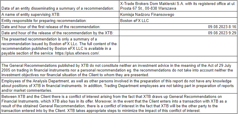 Questo materiale è una comunicazione di marketing ai sensi dell'Art. 24, paragrafo 3, della direttiva 2014/65 / UE del Parlamento europeo e del Consiglio, del 15 maggio 2014, relativa ai mercati degli strumenti finanziari e che modifica la direttiva 2002/92 / CE e la direttiva 2011/61 / UE (MiFID II). La comunicazione di marketing non è una raccomandazione di investimento o informazioni che raccomandano o suggeriscono una strategia di investimento ai sensi del regolamento (UE) n. 596/2014 del Parlamento europeo e del Consiglio, del 16 aprile 2014, relativo agli abusi di mercato (regolamento sugli abusi di mercato) e che abroga la direttiva 2003/6 / CE del Parlamento europeo e del Consiglio e direttive della Commissione 2003/124 / CE, 2003/125 / CE e 2004/72 / CE e regolamento delegato (UE) 2016/958 della Commissione, del 9 marzo 2016, che integra il regolamento UE) n. 596/2014 del Parlamento europeo e del Consiglio per quanto riguarda le norme tecniche di regolamentazione per le disposizioni tecniche per la presentazione obiettiva di raccomandazioni di investimento o altre informazioni che raccomandano o suggeriscono una strategia di investimento e per la divulgazione di particolari interessi o indicazioni di conflitti di interessi o qualsiasi altra consulenza, anche nell'ambito della consulenza sugli investimenti, ai sensi della legge sugli strumenti finanziari del 29 luglio 2005 (ad es. Journal of Laws 2019, voce 875, come modificata). La comunicazione di marketing è preparata con la massima diligenza, obiettività, presenta i fatti noti all'autore alla data di preparazione ed è priva di elementi di valutazione. La comunicazione di marketing viene preparata senza considerare le esigenze del cliente, la sua situazione finanziaria individuale e non presenta alcuna strategia di investimento in alcun modo. La comunicazione di marketing non costituisce un'offerta di vendita, offerta, abbonamento, invito all'acquisto, pubblicità o promozione di strumenti finanziari. XTB S.A. non è responsabile per eventuali azioni o omissioni del cliente, in particolare per l'acquisizione o la cessione di strumenti finanziari. XTB non si assume alcuna responsabilità per qualsiasi perdita o danno, anche senza limitazione, eventuali perdite, che possono insorgere direttamente o indirettamente, intrapresa sulla base delle informazioni contenute in questa comunicazione di marketing. Nel caso in cui la comunicazione di marketing contenga informazioni su eventuali risultati relativi agli strumenti finanziari ivi indicati, questi non costituiscono alcuna garanzia o previsione relativa ai risultati futuri. Le prestazioni passate non sono necessariamente indicative dei risultati futuri, e chiunque agisca su queste informazioni lo fa interamente a proprio rischio.