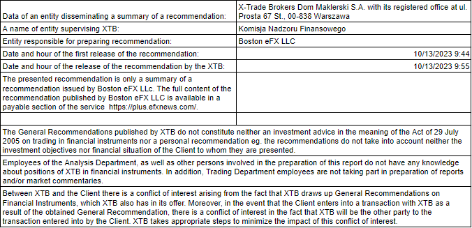 Questo materiale è una comunicazione di marketing ai sensi dell'Art. 24, paragrafo 3, della direttiva 2014/65 / UE del Parlamento europeo e del Consiglio, del 15 maggio 2014, relativa ai mercati degli strumenti finanziari e che modifica la direttiva 2002/92 / CE e la direttiva 2011/61 / UE (MiFID II). La comunicazione di marketing non è una raccomandazione di investimento o informazioni che raccomandano o suggeriscono una strategia di investimento ai sensi del regolamento (UE) n. 596/2014 del Parlamento europeo e del Consiglio, del 16 aprile 2014, relativo agli abusi di mercato (regolamento sugli abusi di mercato) e che abroga la direttiva 2003/6 / CE del Parlamento europeo e del Consiglio e direttive della Commissione 2003/124 / CE, 2003/125 / CE e 2004/72 / CE e regolamento delegato (UE) 2016/958 della Commissione, del 9 marzo 2016, che integra il regolamento UE) n. 596/2014 del Parlamento europeo e del Consiglio per quanto riguarda le norme tecniche di regolamentazione per le disposizioni tecniche per la presentazione obiettiva di raccomandazioni di investimento o altre informazioni che raccomandano o suggeriscono una strategia di investimento e per la divulgazione di particolari interessi o indicazioni di conflitti di interessi o qualsiasi altra consulenza, anche nell'ambito della consulenza sugli investimenti, ai sensi della legge sugli strumenti finanziari del 29 luglio 2005 (ad es. Journal of Laws 2019, voce 875, come modificata). La comunicazione di marketing è preparata con la massima diligenza, obiettività, presenta i fatti noti all'autore alla data di preparazione ed è priva di elementi di valutazione. La comunicazione di marketing viene preparata senza considerare le esigenze del cliente, la sua situazione finanziaria individuale e non presenta alcuna strategia di investimento in alcun modo. La comunicazione di marketing non costituisce un'offerta di vendita, offerta, abbonamento, invito all'acquisto, pubblicità o promozione di strumenti finanziari. XTB S.A. non è responsabile per eventuali azioni o omissioni del cliente, in particolare per l'acquisizione o la cessione di strumenti finanziari. XTB non si assume alcuna responsabilità per qualsiasi perdita o danno, anche senza limitazione, eventuali perdite, che possono insorgere direttamente o indirettamente, intrapresa sulla base delle informazioni contenute in questa comunicazione di marketing. Nel caso in cui la comunicazione di marketing contenga informazioni su eventuali risultati relativi agli strumenti finanziari ivi indicati, questi non costituiscono alcuna garanzia o previsione relativa ai risultati futuri. Le prestazioni passate non sono necessariamente indicative dei risultati futuri, e chiunque agisca su queste informazioni lo fa interamente a proprio rischio.