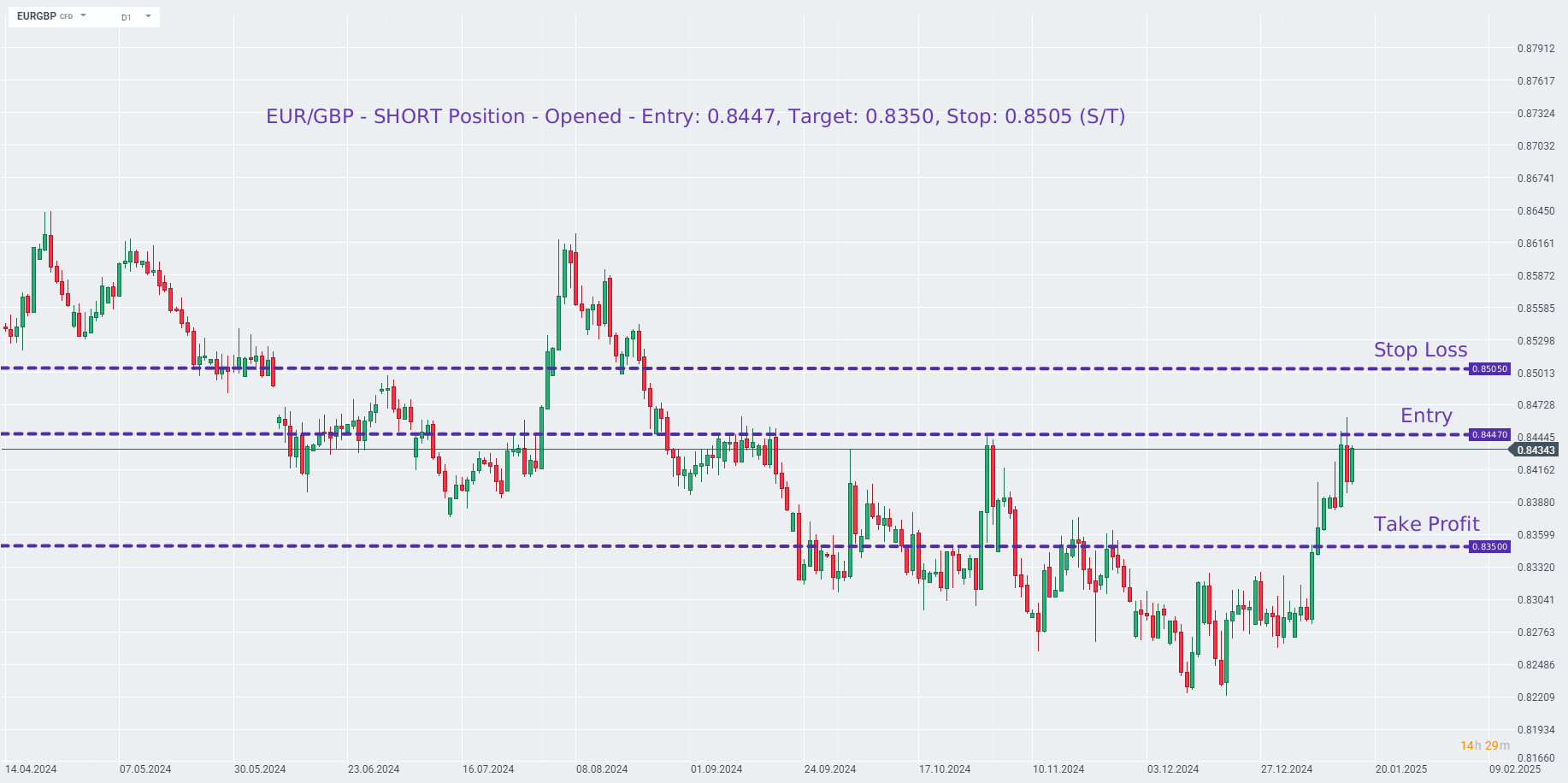 LSEG consiglia di assumere una posizione corta su EURGBP al prezzo di mercato con un obiettivo di 0,8350 e un ordine di stop loss a 0,8505. Fonte: xStation 5