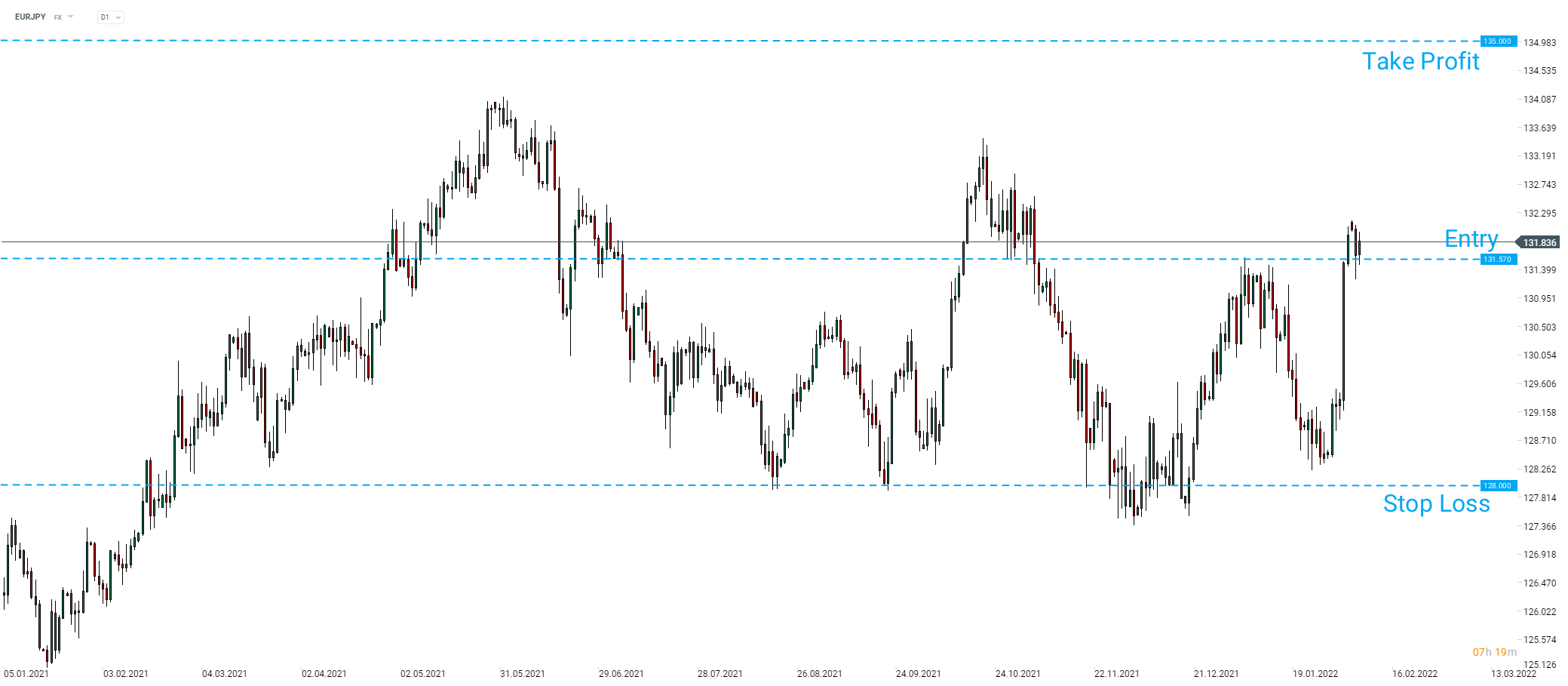 Morgan Stanley consiglia di aprire una posizione Long su EURJPY al prezzo di mercato con un obiettivo di 135,00 e uno stop loss collocato a 128,00. Fonte: xStation5