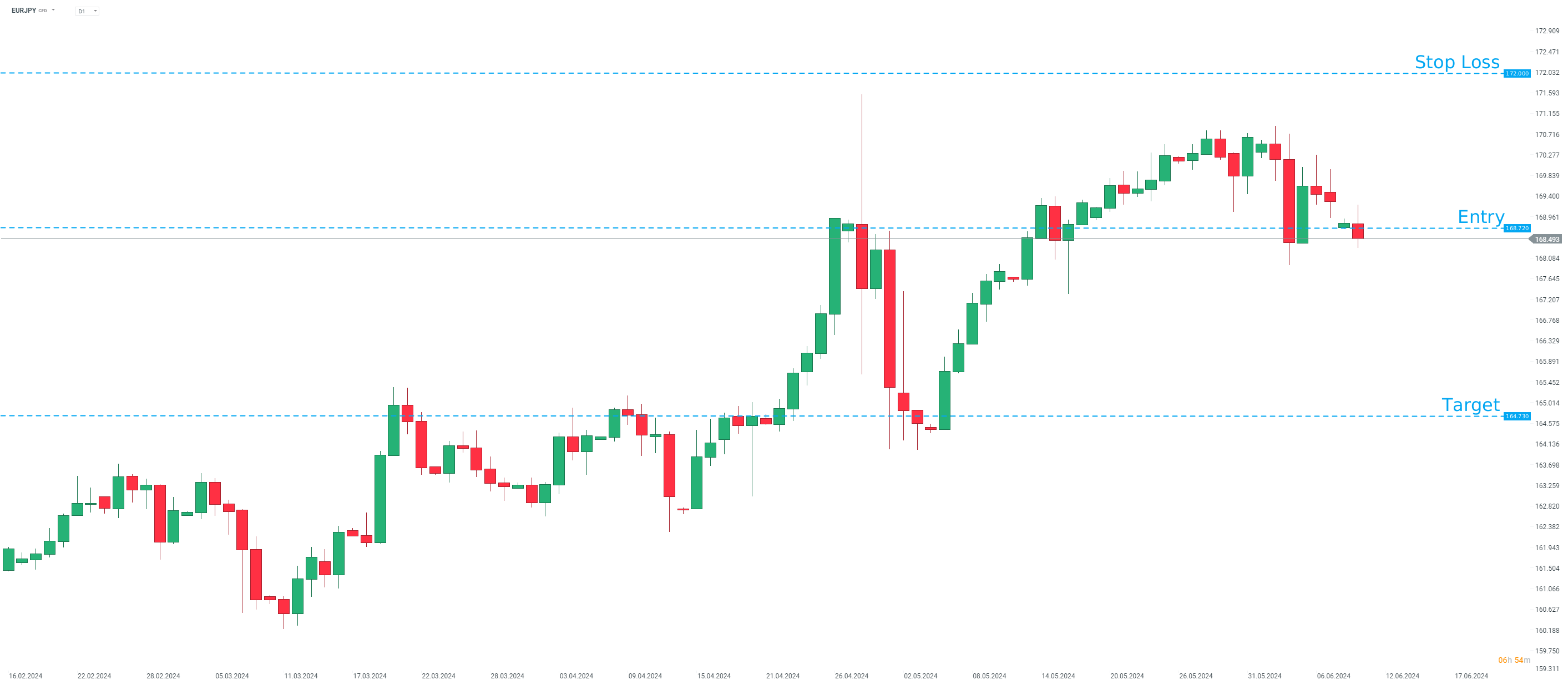 Credit Agricole consiglia di assumere una posizione short sull'EURJPY al prezzo di mercato con un target di 164,73 e un ordine di stop loss piazzato a 172,00. Fonte: xStation5