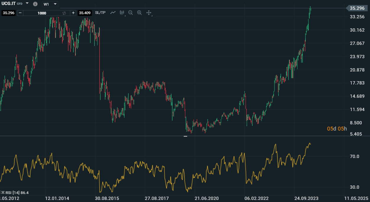 Ipercomprato su base settimanale sul titolo Unicredit - Fonte: XStation