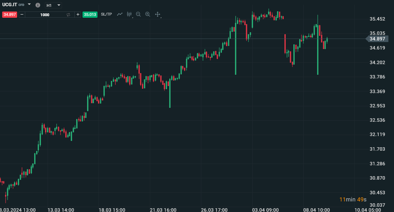 Grafico intraday di Unicredit su base oraria - Fonte:XStation
