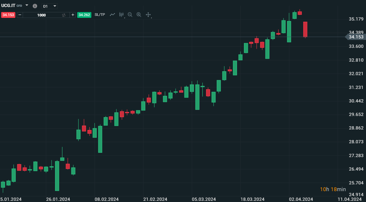 Grafico giornaliero di Unicredit su base daily. Da notare la candela di oggi fortemente negativa - Fonte:XStation