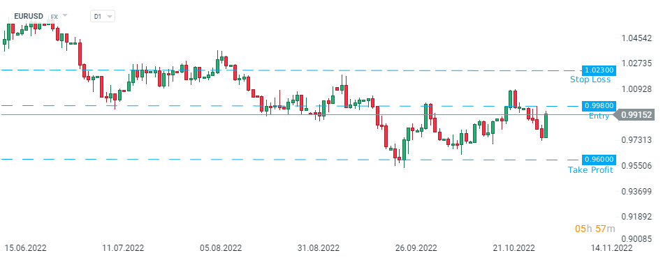 ANZ consiglia di aprire un limit order Short su EURUSD a 0,9980 con un target di 0,9600 e un ordine stop loss collocato a 1,0230. Fonte: xStation5