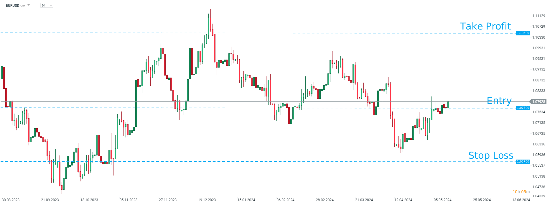 MUFG consiglia di assumere una posizione lunga sull'EURUSD al prezzo di mercato con un obiettivo di 1,0770 e un ordine di stop loss piazzato a 1,0570. Fonte: xStation5