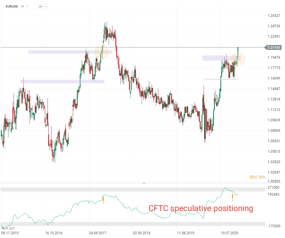 Questo è molto chiaro se confrontiamo la situazione con il gennaio 2018, quando i mercati erano di umore euforico, facendo salire le azioni e abbassando l'USD. L'EURUSD è uscito da un consolidamento simile e - questo è un avvertimento per i venditori - è salito sopra 1,25, anche se solo per un breve periodo di tempo. Un'altra sorprendente somiglianza sono i livelli estremi del posizionamento speculativo netto in EUR che alla fine hanno pesato sulla coppia, ma non fino a quando non sono stati realizzati alcuni importanti guadagni.