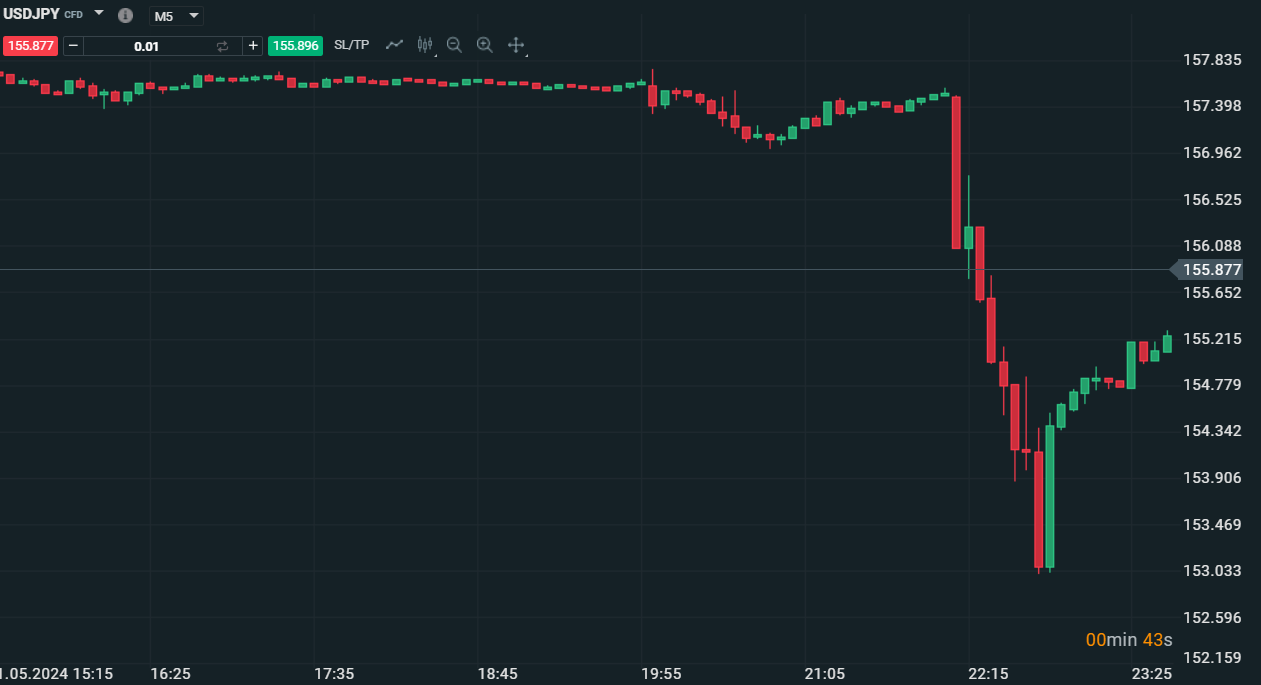 Mentre le voci circa un intervento della Bank of Japan rimangono ancora tali senza una conferma, il cambio UsdJpy assesta un altro duro colpo al dollaro americano crollando in serata di circa 5 figure da area 158 fino a 153. Il primo intervento di lunedí rimane un sospetto ma, osservando le dinamiche di prezzo, l'entitá del movimento é analoga a quella vista sia nel primo che nel secondo intervento del 2022. Facile quindi ipotizzare un intervento nella giornata di lunedí, ma ora la situazione si fa interessante visto che un movimento di simile entitá, ossia 5 figure, si é manifestato subito dopo la conferenza stampa di Powell. Possibile che sia un altro intervento? Stando all'analisi dei movimenti sembrerebbe proprio che la Boj sia intervenuta due volte in 3 giorni, una dinamica particolare che andrebbe eventualmente ad innescare dei fortissimi movimenti ribassisti che potrebbero portare il cambio a ritoccare i 152 a breve e poi i 147, livello prossimo al primo intervento del 2022. Molto probabilmente stiamo assistendo ad un'inversione ribassista di lungo periodo sul cambio.