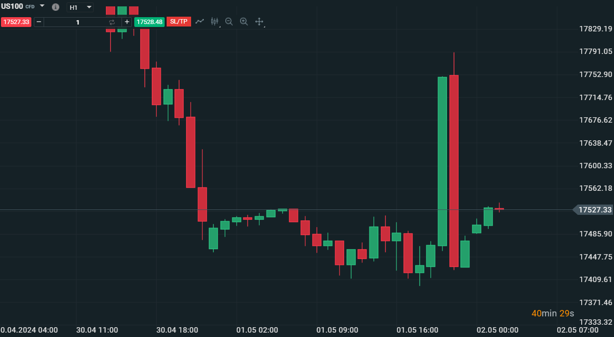 Movimento su Nasdaq timeframe 1h con le due candele che si annullanno a ridosso del FOMC - Fonte:XStation