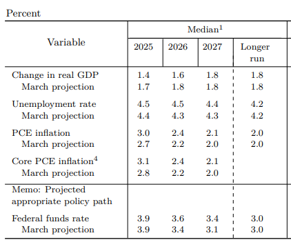Pil che passa da 1,7% a 1,4% per il 2025, disoccupazione che passa dal 4,4% al 4,5%, salgono le stime per il Pce e Pce Core mentre rimangono uguali le stime sui tassi che di fatto vedono solamente due tagli per il 2025. Osservando anche le stime del marzo 2025, quello che vediamo ora é il secondo peggioramento consecutivo delle stime sul Pil e sulla Disoccupazione, segno del fatto che l'attivitá economica sta rallentando ma non ad un ritmo preoccupante.