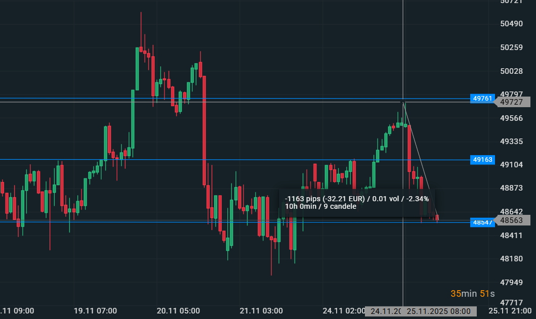 Un ribasso interessante dal punto di vista tecnico, un calo di oltre il -2% dai massimi visti nella serata di ieri. Attenzione a questa dinamica in quanto su base settimanale abbiamo una buona probabilitá di vedere una settimana dove il trend ribassista potrebbe fermarsi per via dei test dei supporti tecnici di lungo periodo. Un ribasso che potrebbe influenzare la prima parte della mattinata in Europa, sessione fondamentale per il destino dei mercati Usa che ricordiamo chiudere nella giornata di giovedí per via della festa del Ringraziamento. Nel caso specifico del Nikkei sono stati venduti livelli di massimi a ridosso dei 49500-49700, livelli che tra il 14 e il 20 novembre hanno avuto rilevanza come punti di svolta su base giornaliera.