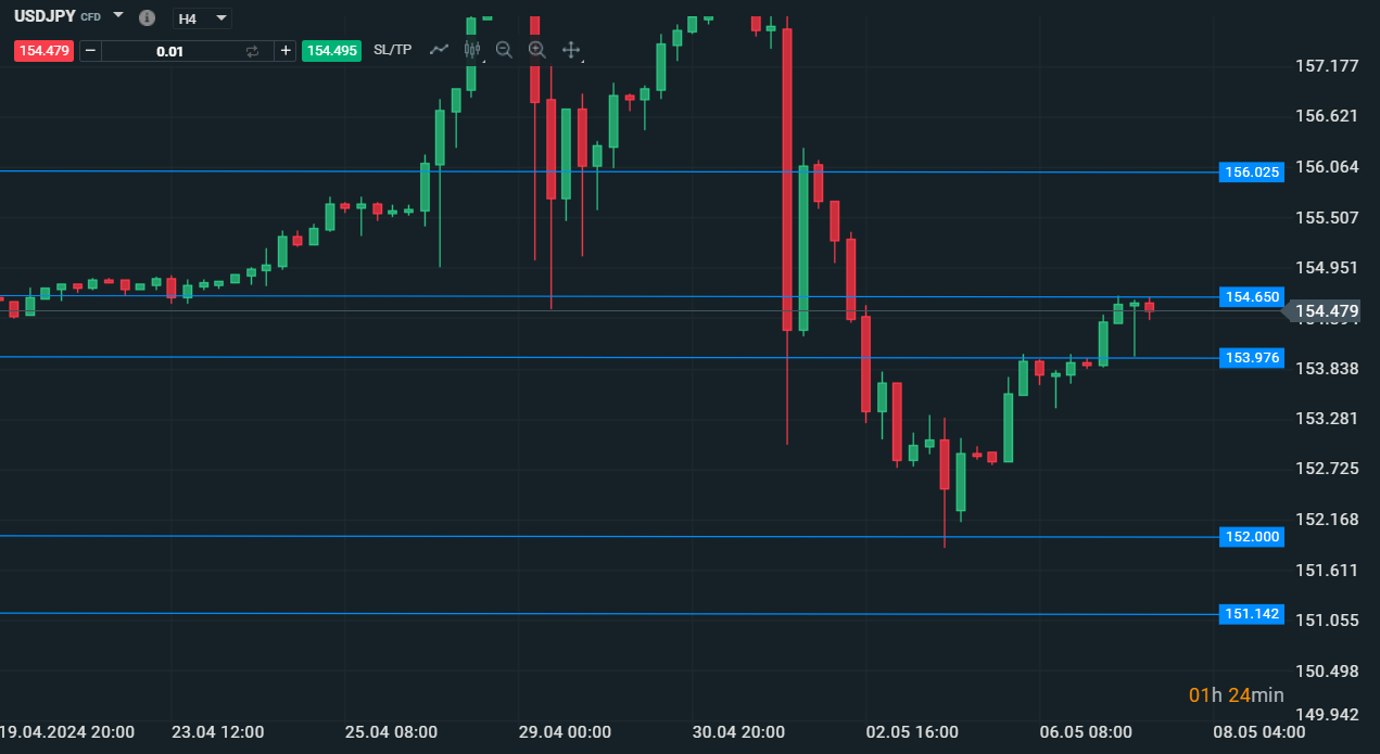UsdJpy timeframe 4 ore e il test di area 154,50 in multiday - Fonte:XStation