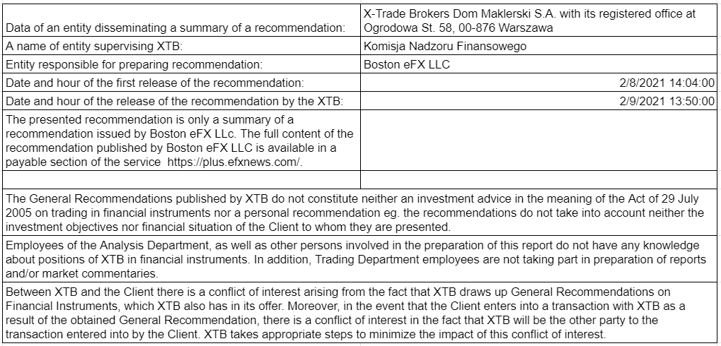 Questo materiale è una comunicazione di marketing ai sensi dell'Art. 24, paragrafo 3, della direttiva 2014/65 / UE del Parlamento europeo e del Consiglio, del 15 maggio 2014, relativa ai mercati degli strumenti finanziari e che modifica la direttiva 2002/92 / CE e la direttiva 2011/61 / UE (MiFID II). La comunicazione di marketing non è una raccomandazione di investimento o informazioni che raccomandano o suggeriscono una strategia di investimento ai sensi del regolamento (UE) n. 596/2014 del Parlamento europeo e del Consiglio, del 16 aprile 2014, relativo agli abusi di mercato (regolamento sugli abusi di mercato) e che abroga la direttiva 2003/6 / CE del Parlamento europeo e del Consiglio e direttive della Commissione 2003/124 / CE, 2003/125 / CE e 2004/72 / CE e regolamento delegato (UE) 2016/958 della Commissione, del 9 marzo 2016, che integra il regolamento UE) n. 596/2014 del Parlamento europeo e del Consiglio per quanto riguarda le norme tecniche di regolamentazione per le disposizioni tecniche per la presentazione obiettiva di raccomandazioni di investimento o altre informazioni che raccomandano o suggeriscono una strategia di investimento e per la divulgazione di particolari interessi o indicazioni di conflitti di interessi o qualsiasi altra consulenza, anche nell'ambito della consulenza sugli investimenti, ai sensi della legge sugli strumenti finanziari del 29 luglio 2005 (ad es. Journal of Laws 2019, voce 875, come modificata). La comunicazione di marketing è preparata con la massima diligenza, obiettività, presenta i fatti noti all'autore alla data di preparazione ed è priva di elementi di valutazione. La comunicazione di marketing viene preparata senza considerare le esigenze del cliente, la sua situazione finanziaria individuale e non presenta alcuna strategia di investimento in alcun modo. La comunicazione di marketing non costituisce un'offerta di vendita, offerta, abbonamento, invito all'acquisto, pubblicità o promozione di strumenti finanziari. XTB S.A. non è responsabile per eventuali azioni o omissioni del cliente, in particolare per l'acquisizione o la cessione di strumenti finanziari. XTB non si assume alcuna responsabilità per qualsiasi perdita o danno, anche senza limitazione, eventuali perdite, che possono insorgere direttamente o indirettamente, intrapresa sulla base delle informazioni contenute in questa comunicazione di marketing. Nel caso in cui la comunicazione di marketing contenga informazioni su eventuali risultati relativi agli strumenti finanziari ivi indicati, questi non costituiscono alcuna garanzia o previsione relativa ai risultati futuri. Le prestazioni passate non sono necessariamente indicative dei risultati futuri, e chiunque agisca su queste informazioni lo fa interamente a proprio rischio.