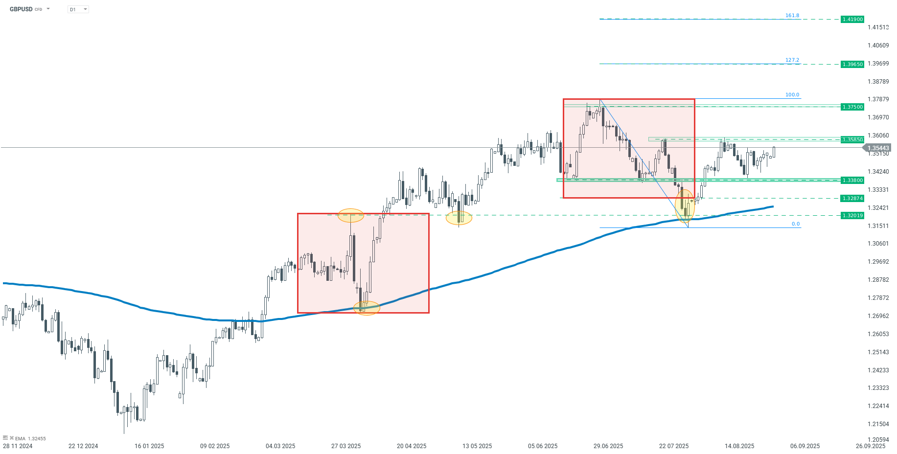 Dopo il rimbalzo dal supporto indicato, il prezzo è tornato al pattern 1:1 (rettangolo rosso), a sostegno dello scenario di un ritorno al trend rialzista. Attualmente, il prezzo si avvicina alla resistenza locale a 1,3585, anch’essa derivante da precedenti reazioni di prezzo. Se tale livello verrà superato, il prezzo potrebbe muoversi verso la resistenza a 1,3750. In caso di ulteriore rottura, le prossime resistenze saranno rappresentate dai livelli di Fibonacci esterni al 127,2% e 161,8%, calcolati a partire dall’ultima correzione al ribasso.